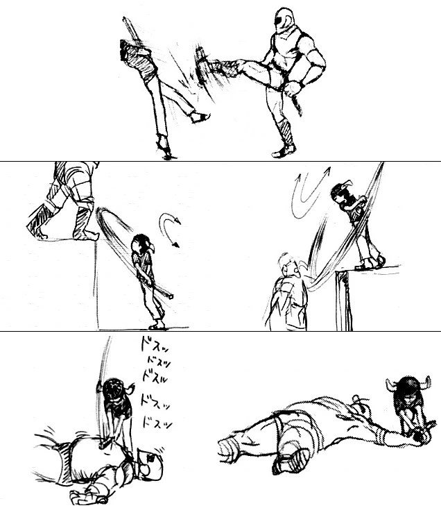 The enemies in Ico were originally designed to be similar to the armored soldiers in The Last Guardian. These foes were easily able to overpower Ico (top row), but he could use the environment to gain an advantage over them by striking from a low or high position (middle row). Ico could then subdue and restrain these foes (bottom row), making the way forward safe at last.
