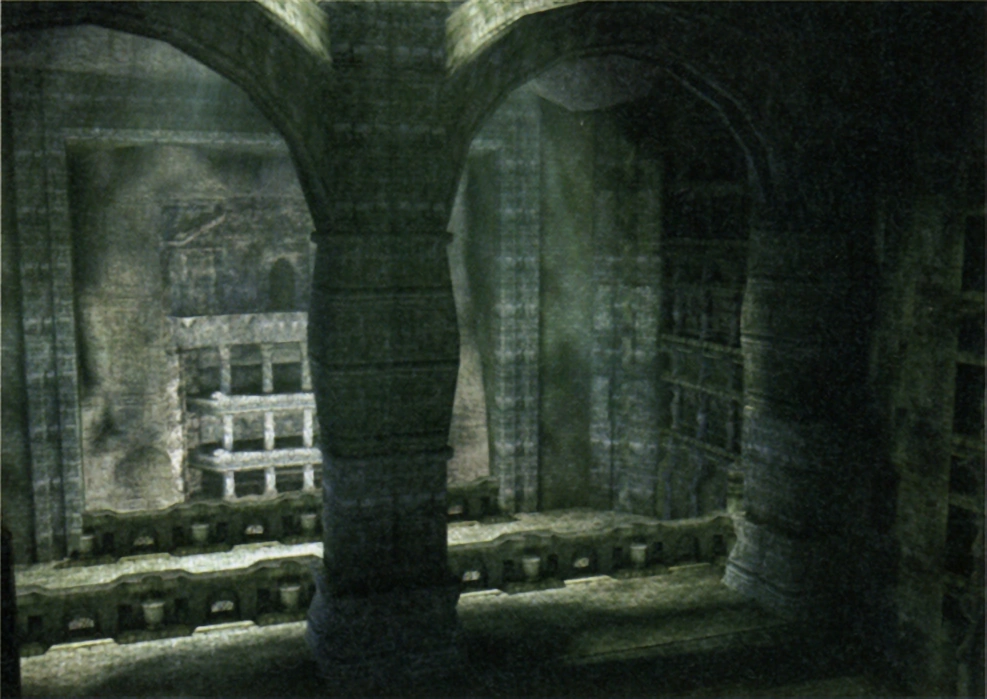 A temple-like place underground. The three rows of stone walls are fragile and can easily collapse when touched by the colossus. There's also an area in the back of the Canossa where Wander can hide.