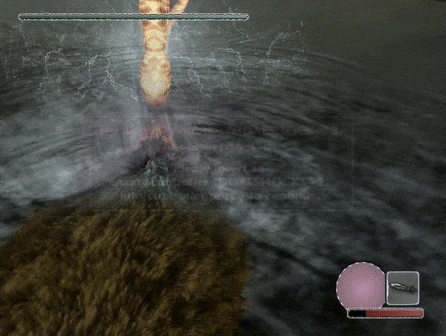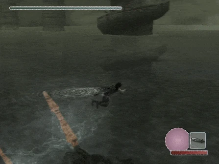 Once Wander's been dragged through the water, the colossus will swim around at the surface of the lake, going in and out of the water to try and dislodge Wander with its electrical spikes. The sword will show the player a small place where they can stab at the base of each spike to disable them, but be very careful; this requires a near-fully charged stab at least, and the electricity will deal a massive amount of damage to Wander if he's too slow. One may not have time to disable all three spikes before it dives back underwater, which will eventually force Wander off. The colossus will soon resurface, however, and Wander doesn't have to disable any spikes he took out previously. When one finally makes their way to its head, they'll find its only major sigil. The colossus will continuously bob its head up and down in the water, so time stabs thoughtfully, as the colossus cannot be stabbed when submerged.