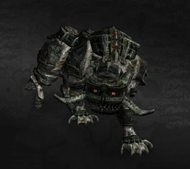 The 11th Colossus, resembling a komainu statue, is one of sixteen bosses fought in Shadow of the Colossus. It is found in a small but deep canyon underneath the north end of the gigantic bridge at quadrant F1.