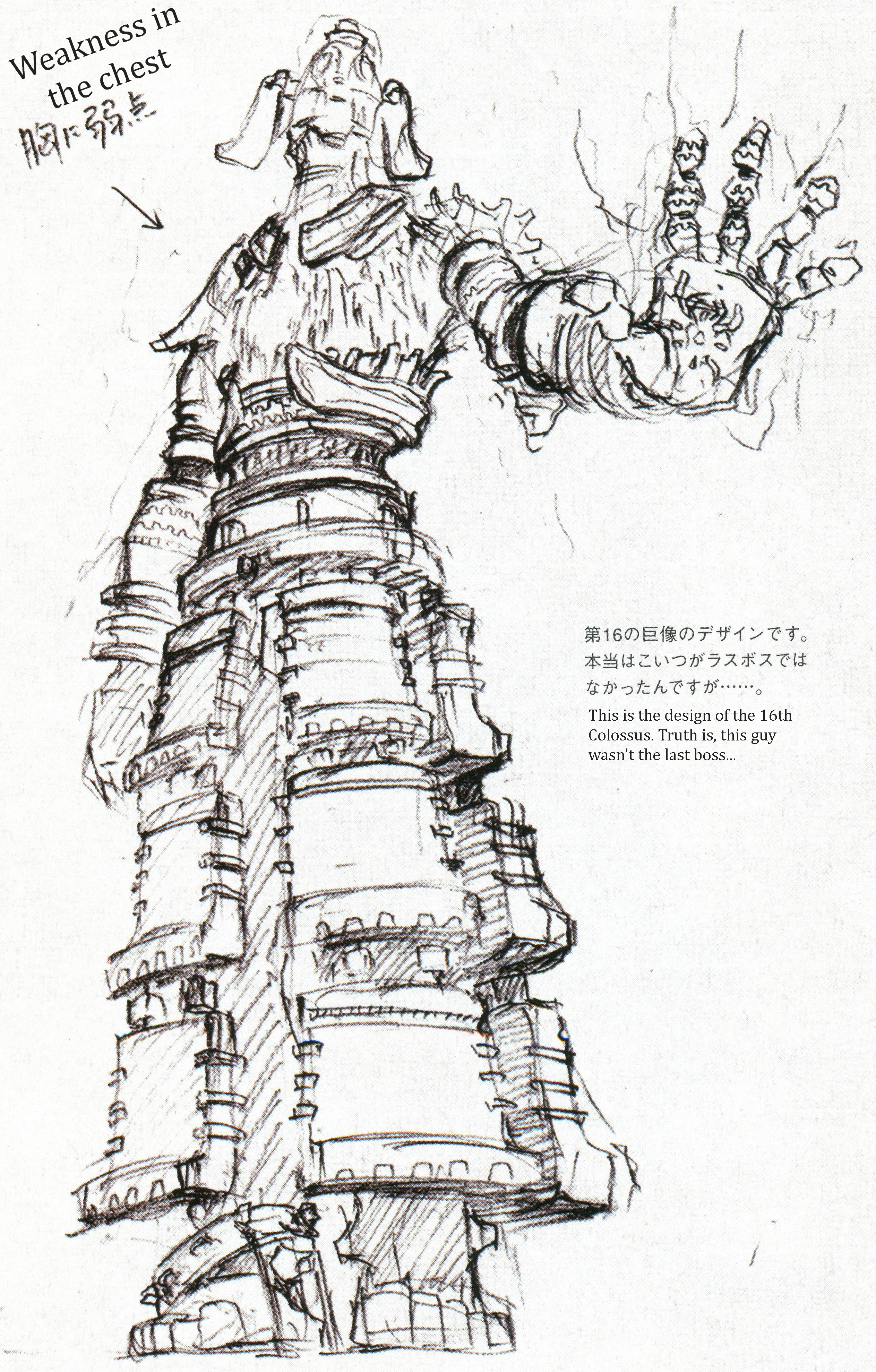 - ↑ "This is the design of the 16th colossus. In truth, this guy was not the last boss..." - Official artbook and guidebook, page 185.
