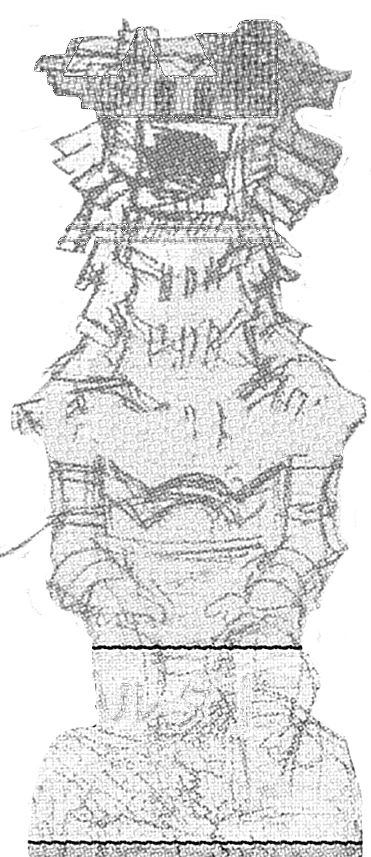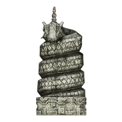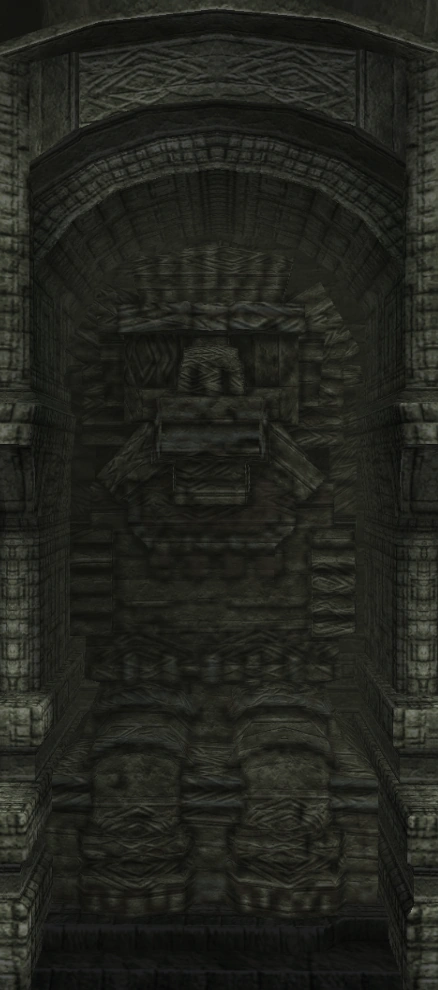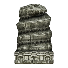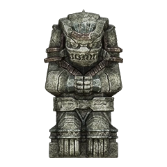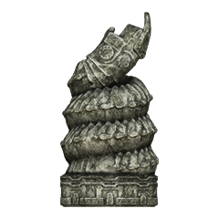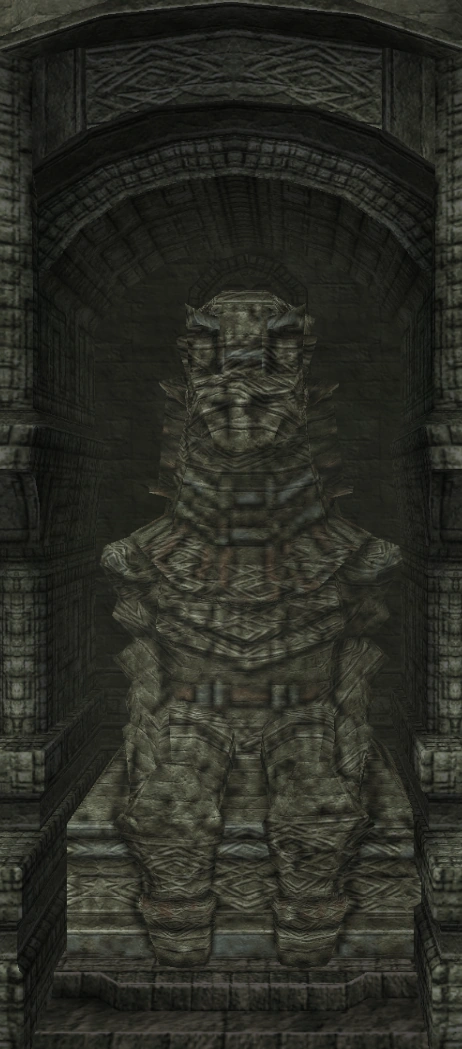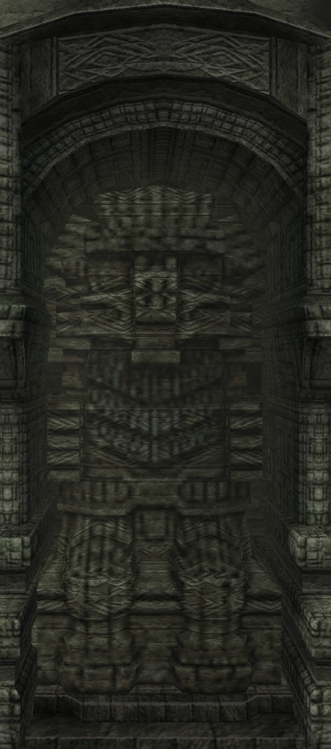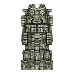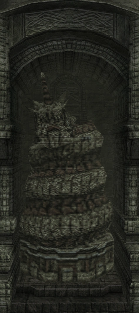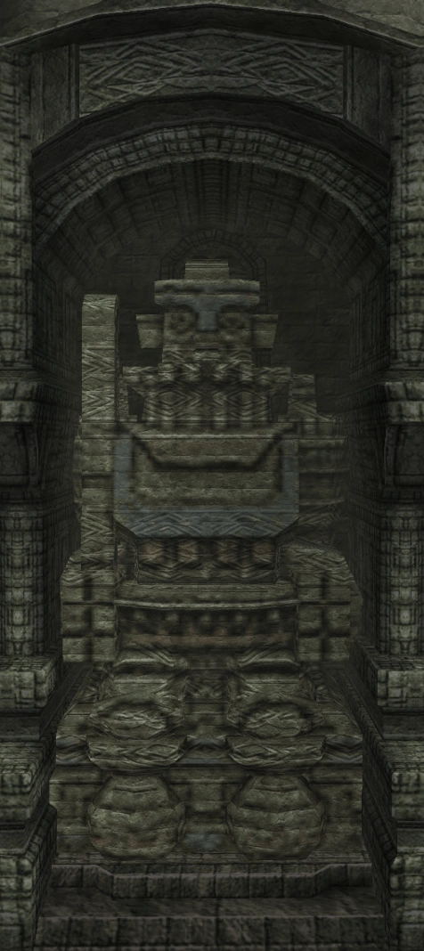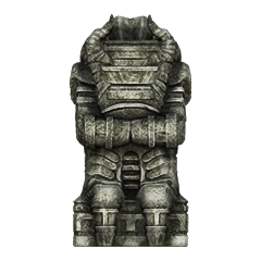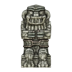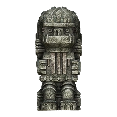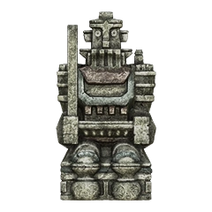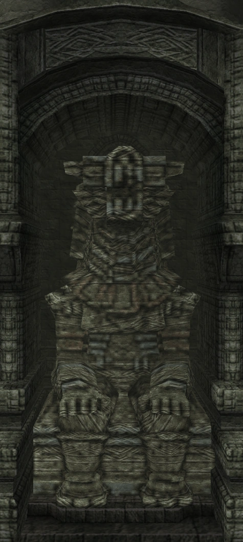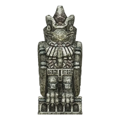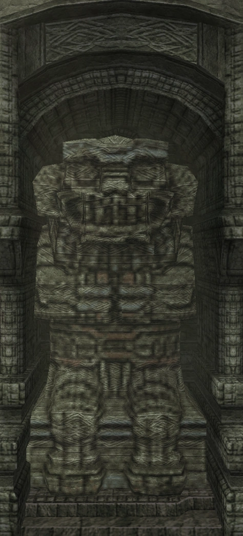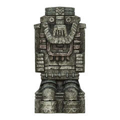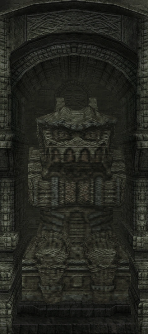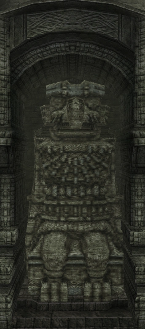 Idol statue of the fourth colossus. Its design is a lot different from what its colossus counterpart looks like. Having a beard-like design on its chest similar to the sixth colossus' idol, and a head resembling the one from its old sketches. The neck is near identical to the one used in the eighth colossus' idol.