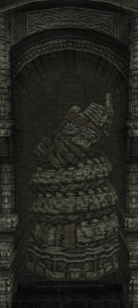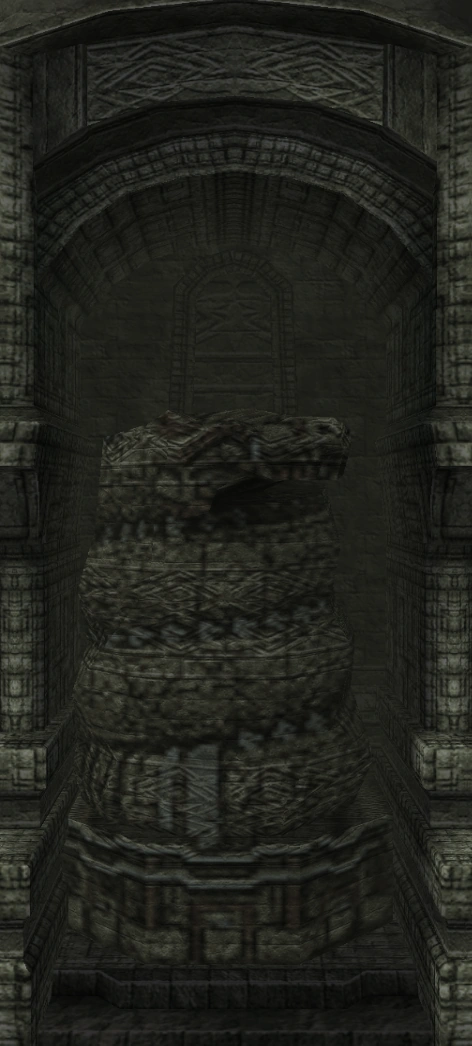 The only idol with a texture remaining thanks to the thirteenth colossus sharing it. It is coiled just like other serpent colossi, with markings all over its body, and a head resembling the one seen in the available screenshots of Worm.
