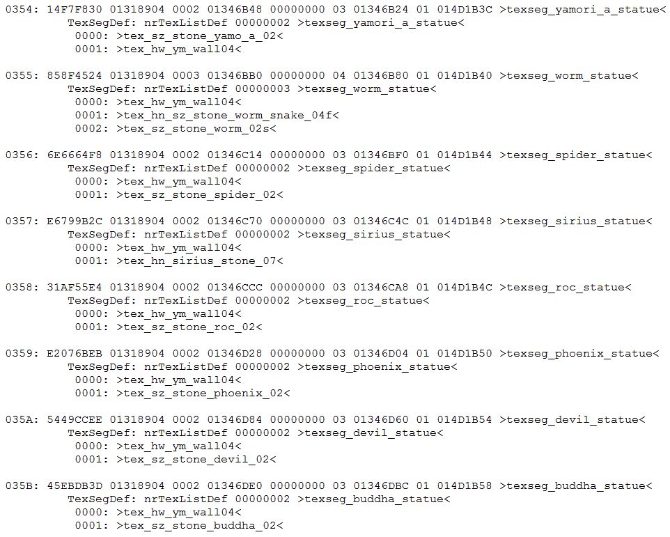Texture segments for all of the unused idol statue models, each listing their own unique textures.