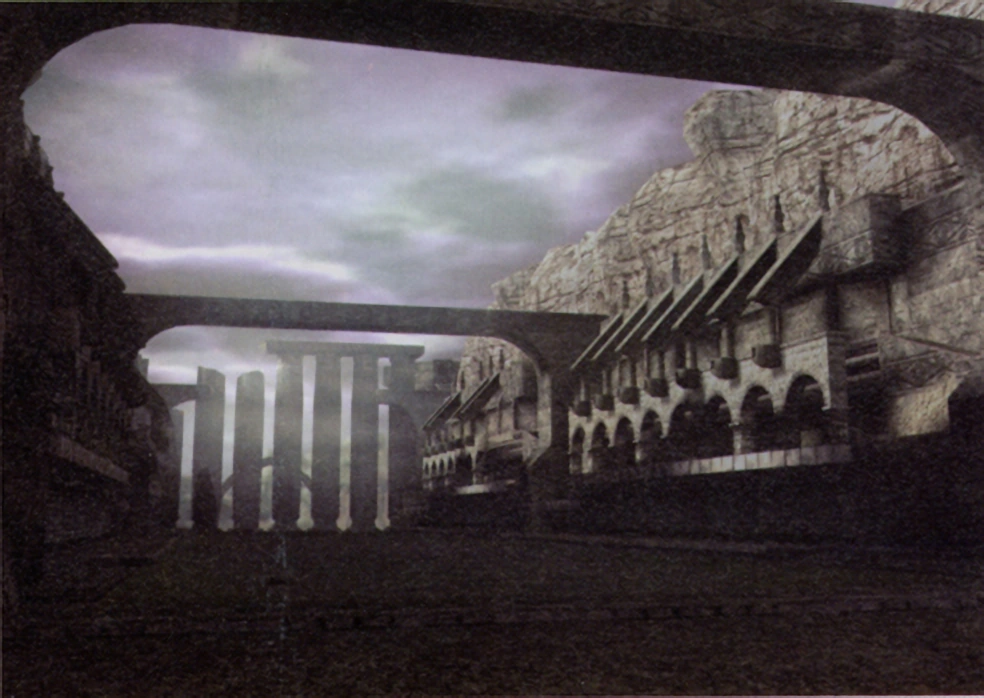 A cobblestone plaza flanked by buildings on both sides. The huge structures are connected by three bridges, one of them broken. On the other side of the arena is a giant valley where the colossus climbs from.
