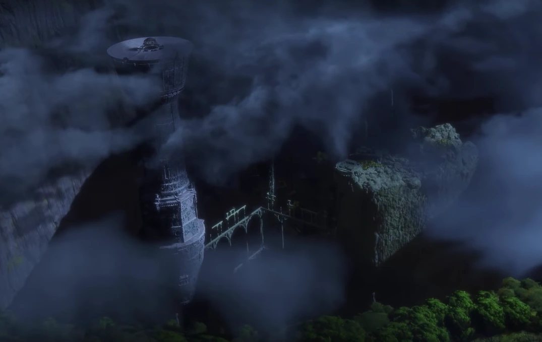 The Sentinel Tower from the air in the final cutscene.
