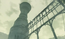 As Trico is unable to fly, the Boy realizes that the best way to escape the nest's insurmountable walls is to get to the top of the massive tower in its center. The bridge leading to this tower partially collapses under Trico's weight and, the way is blocked by several talismans, stained-glass eyes which Trico fears. So the Boy navigates rotting beams and narrow ledges to get to where he can remove these obstacles. However, a huge army of Armored Soldiers ambushes the Boy before he can remove both. Trico initially remains in a bewildered trance, but manages to overcome the instinctual fear and charges to the rescue, saving the Boy but further damaging the bridge. The two barely escape death by miraculously gliding to a nearby tower using Trico's partially-healed wings.