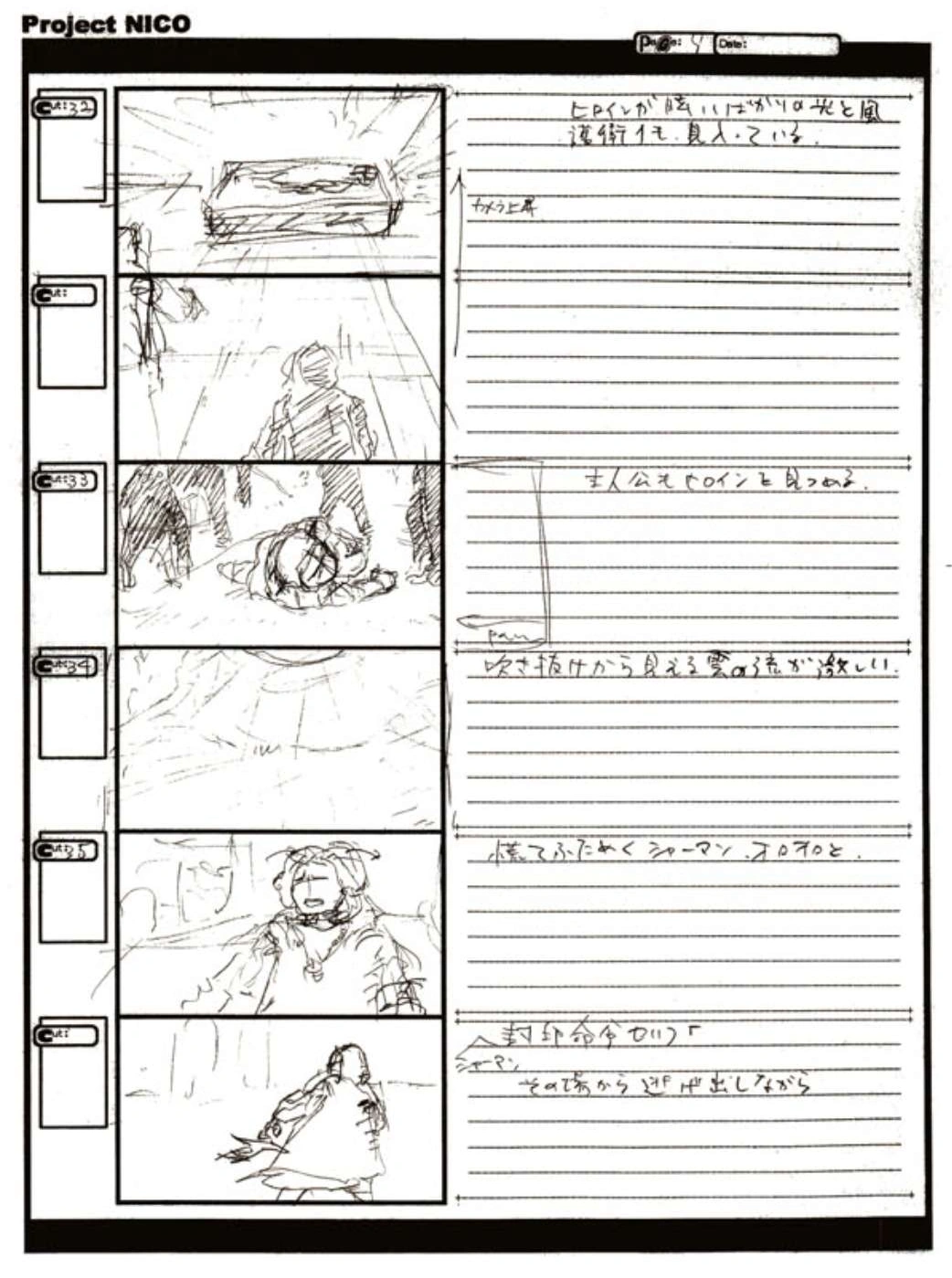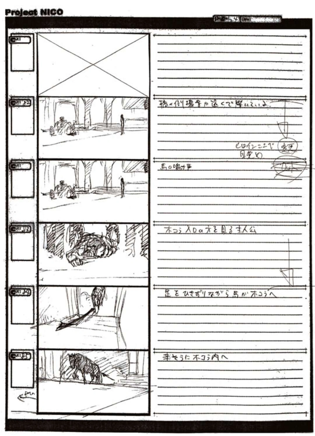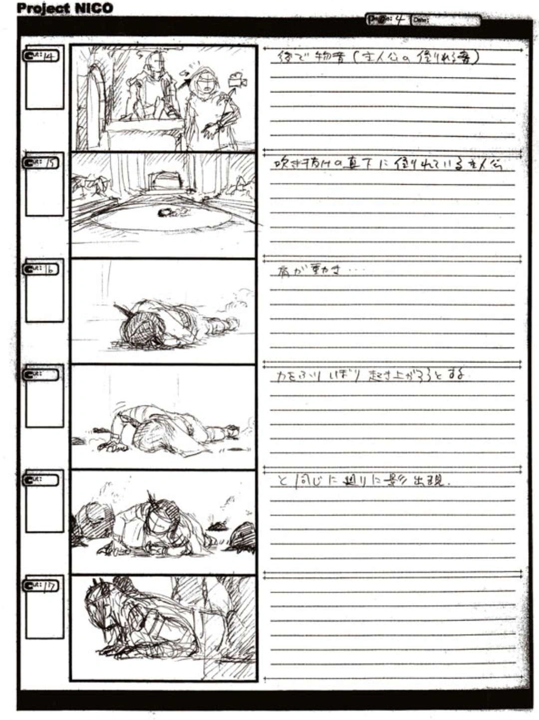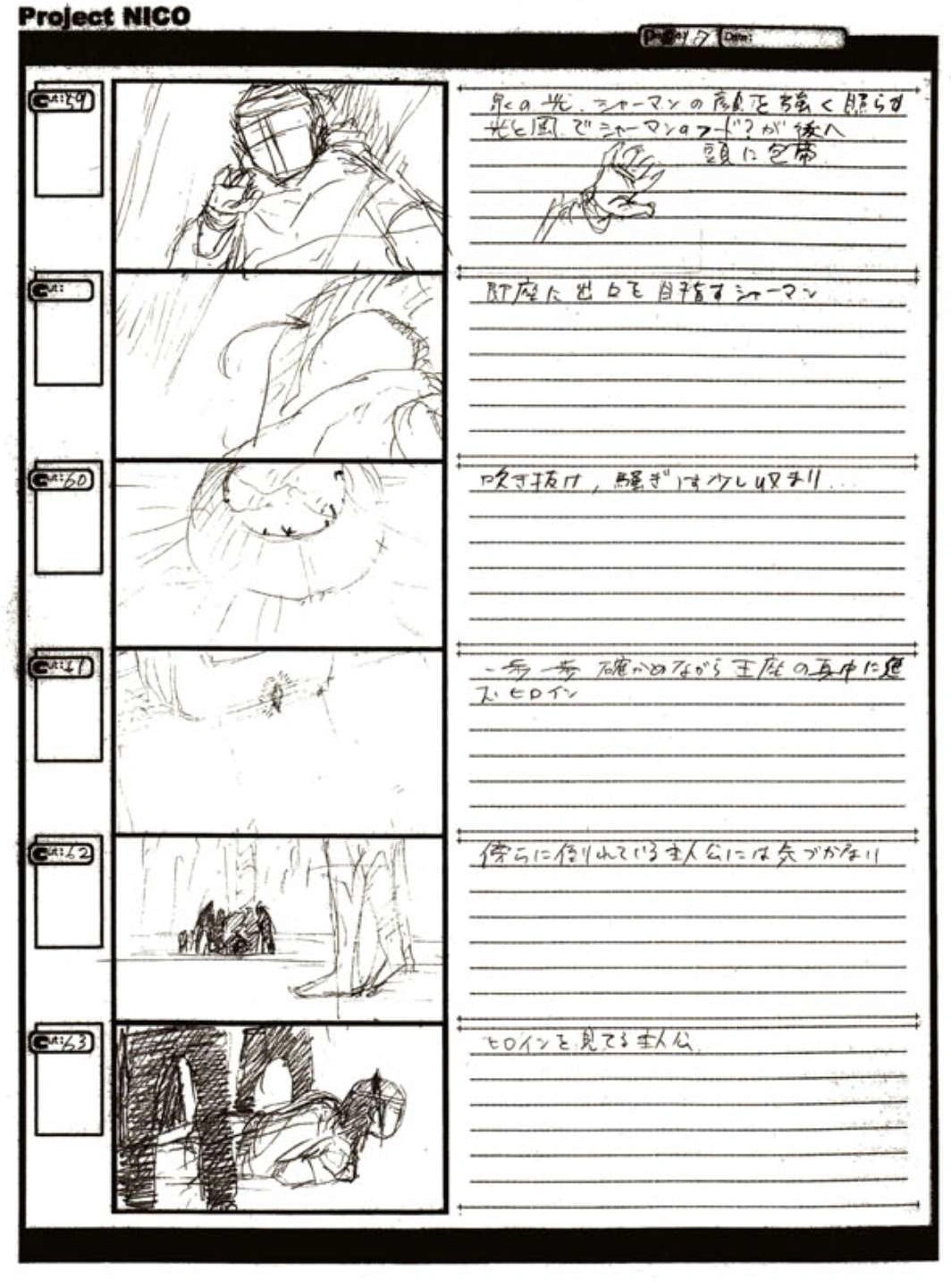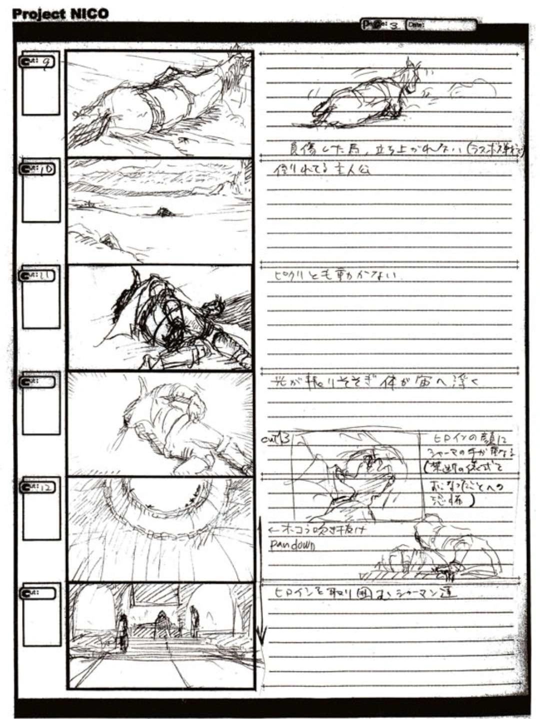 The World of Fumito Ueda artbook has storyboards of the entire alternate ending. They are all below. Translations will come at a later point in time. Pages 1 through 6 are used in the final ending. However, from page 8 onwards the ending differs heavily: In the page 8 of the final ending one of the guards stabs Wander with the Ancient Sword, while in the early ending's page 8 he is saved by Mono instead, leading to a completely different outcome.