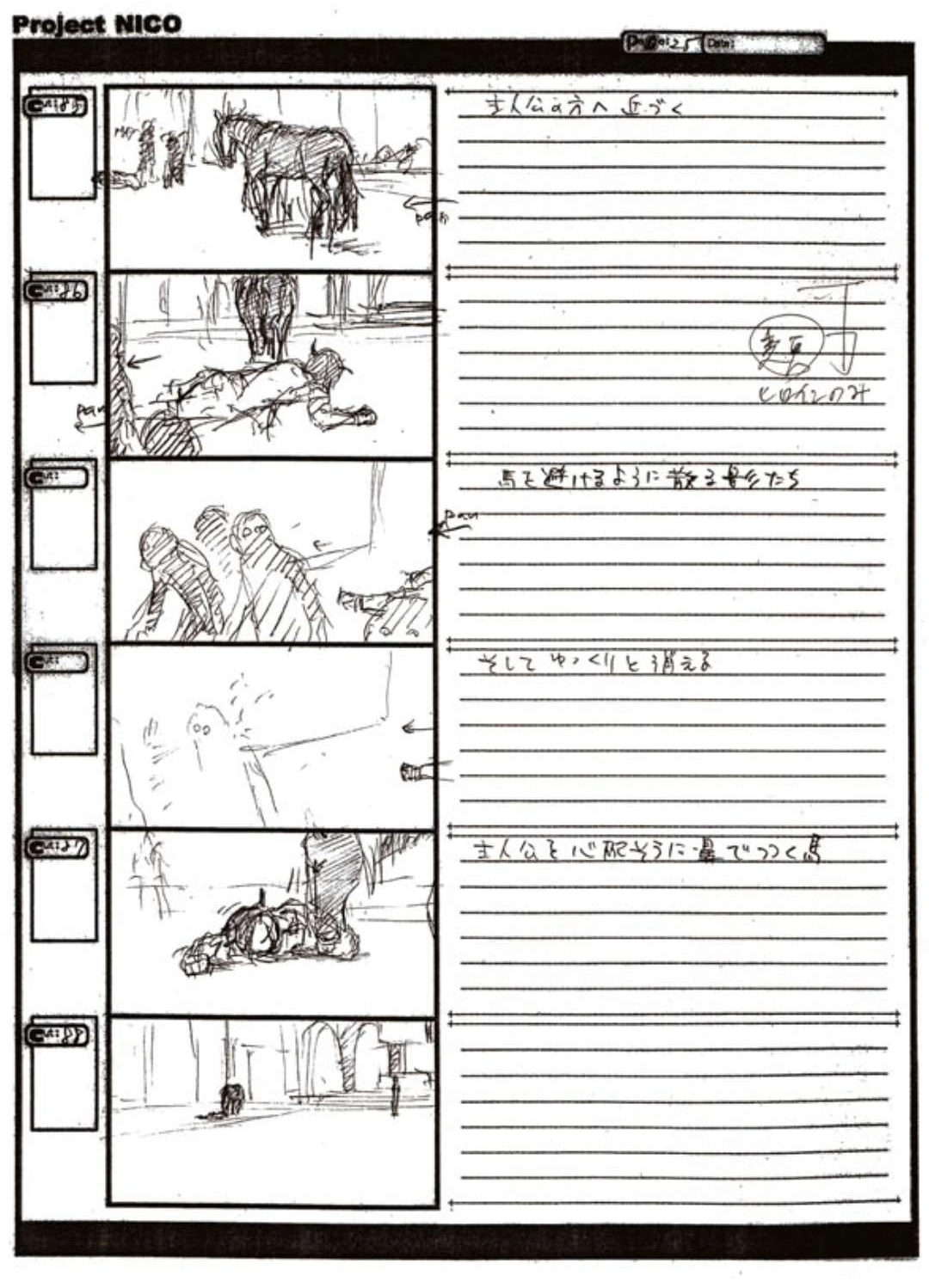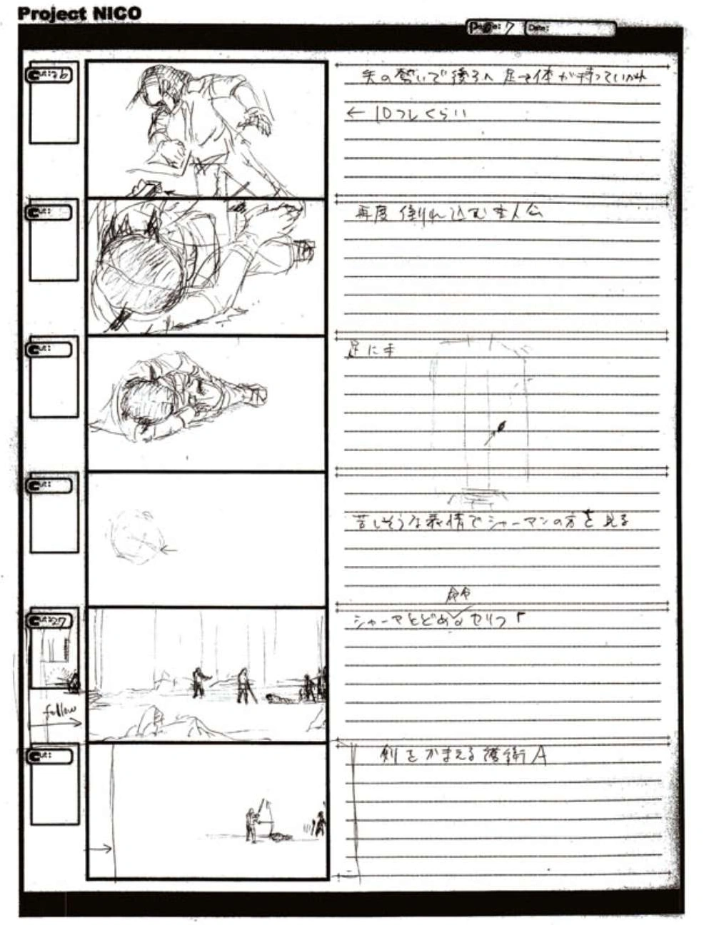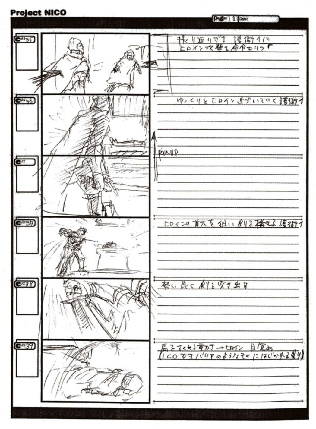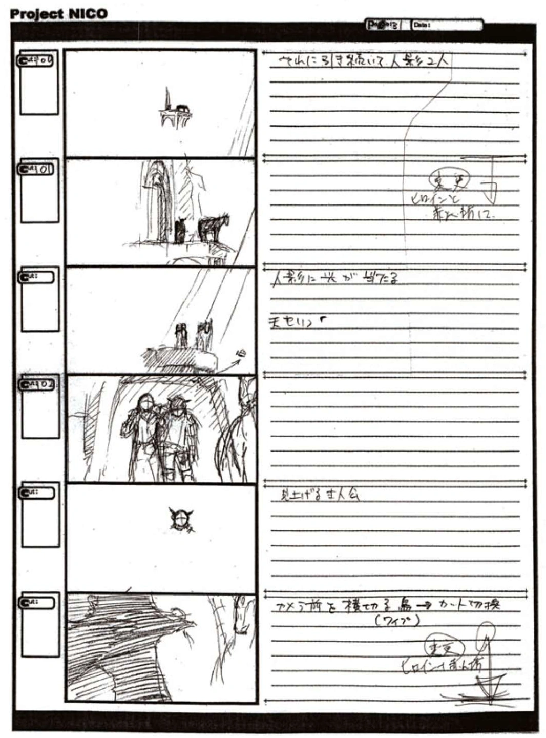 The World of Fumito Ueda artbook has storyboards of the entire alternate ending. They are all below. Translations will come at a later point in time. Pages 1 through 6 are used in the final ending. However, from page 8 onwards the ending differs heavily: In the page 8 of the final ending one of the guards stabs Wander with the Ancient Sword, while in the early ending's page 8 he is saved by Mono instead, leading to a completely different outcome.