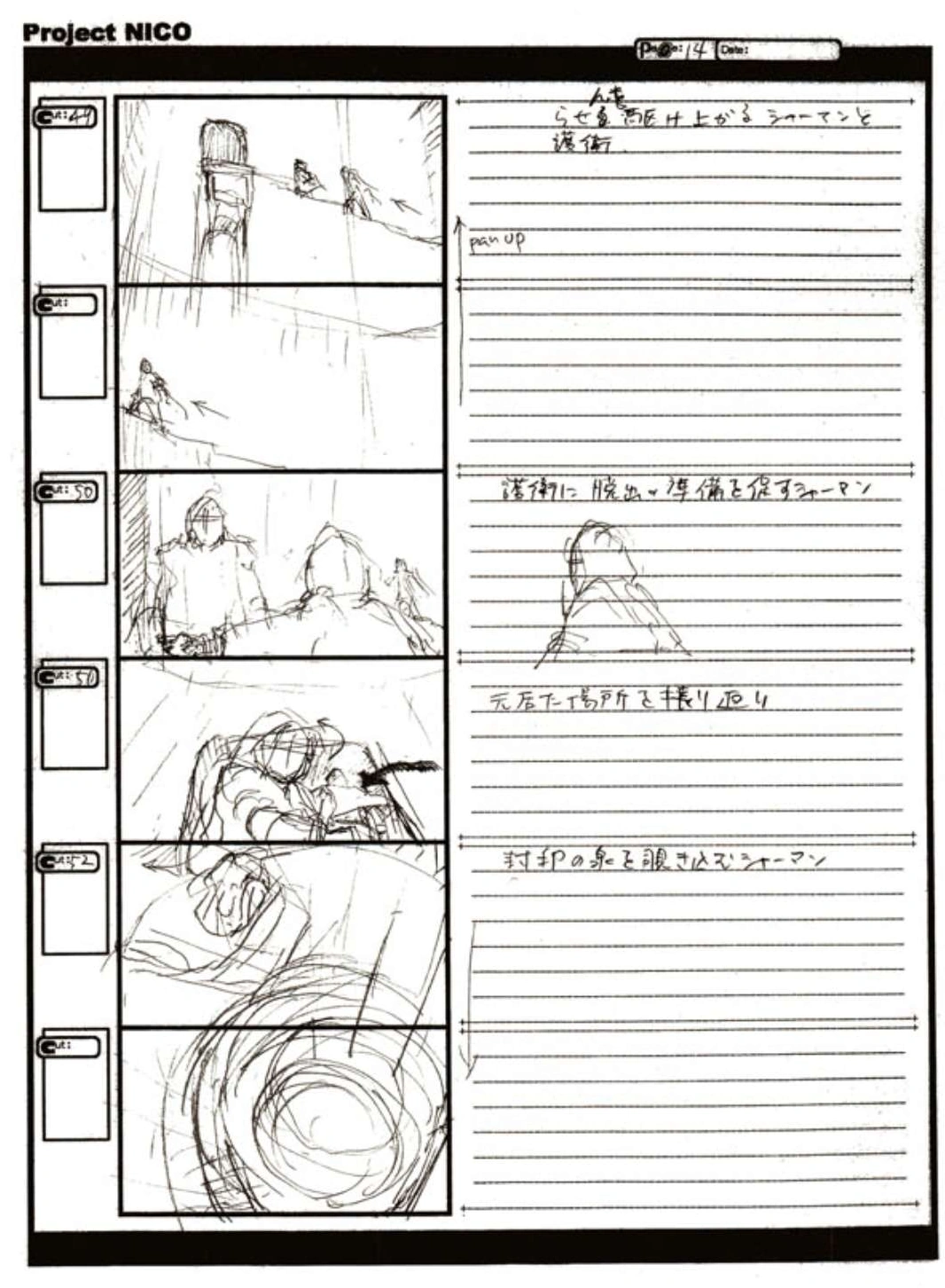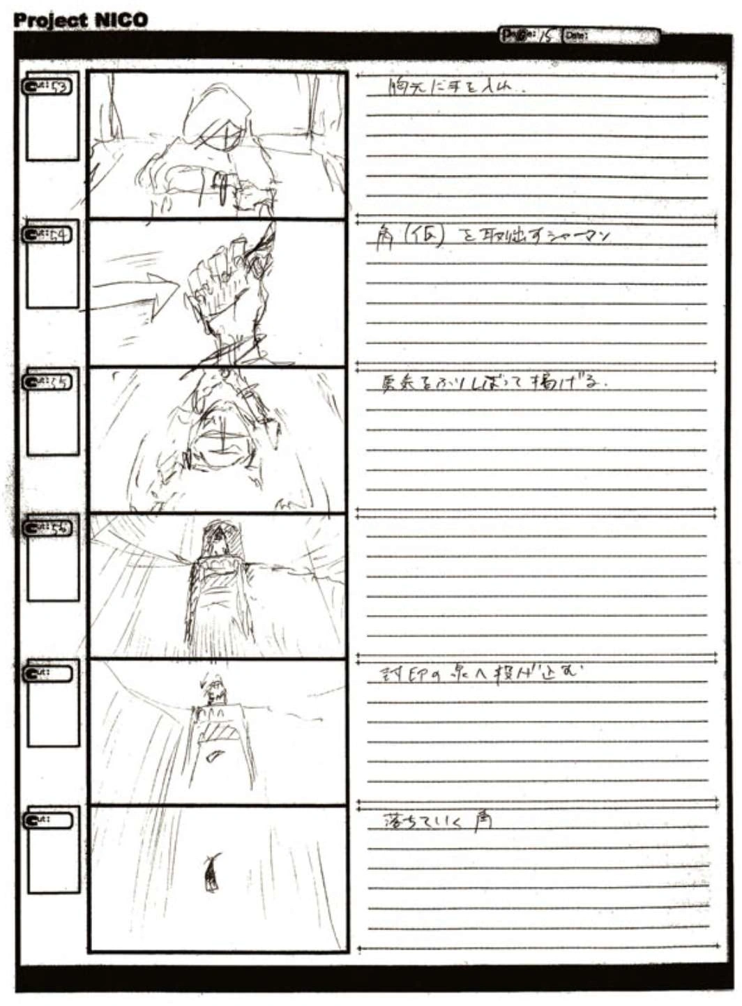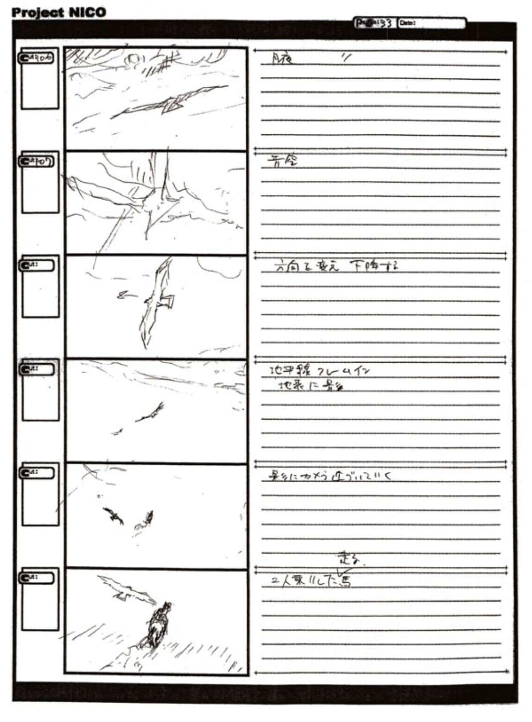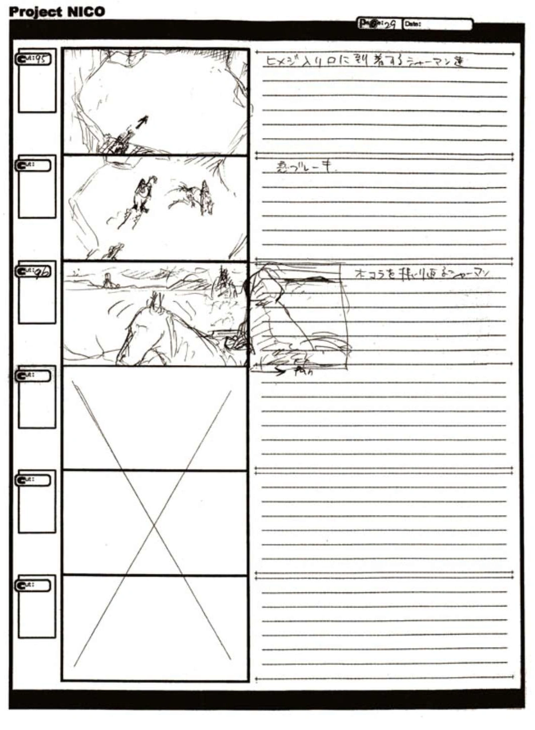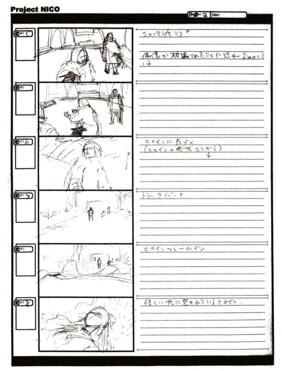 The World of Fumito Ueda artbook has storyboards of the entire alternate ending. They are all below. Translations will come at a later point in time. Pages 1 through 6 are used in the final ending. However, from page 8 onwards the ending differs heavily: In the page 8 of the final ending one of the guards stabs Wander with the Ancient Sword, while in the early ending's page 8 he is saved by Mono instead, leading to a completely different outcome.