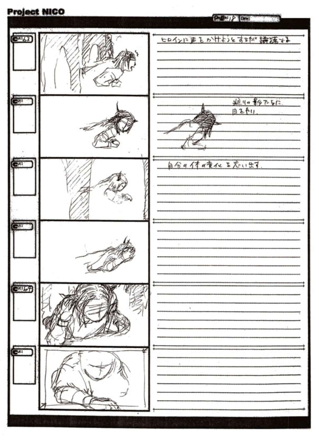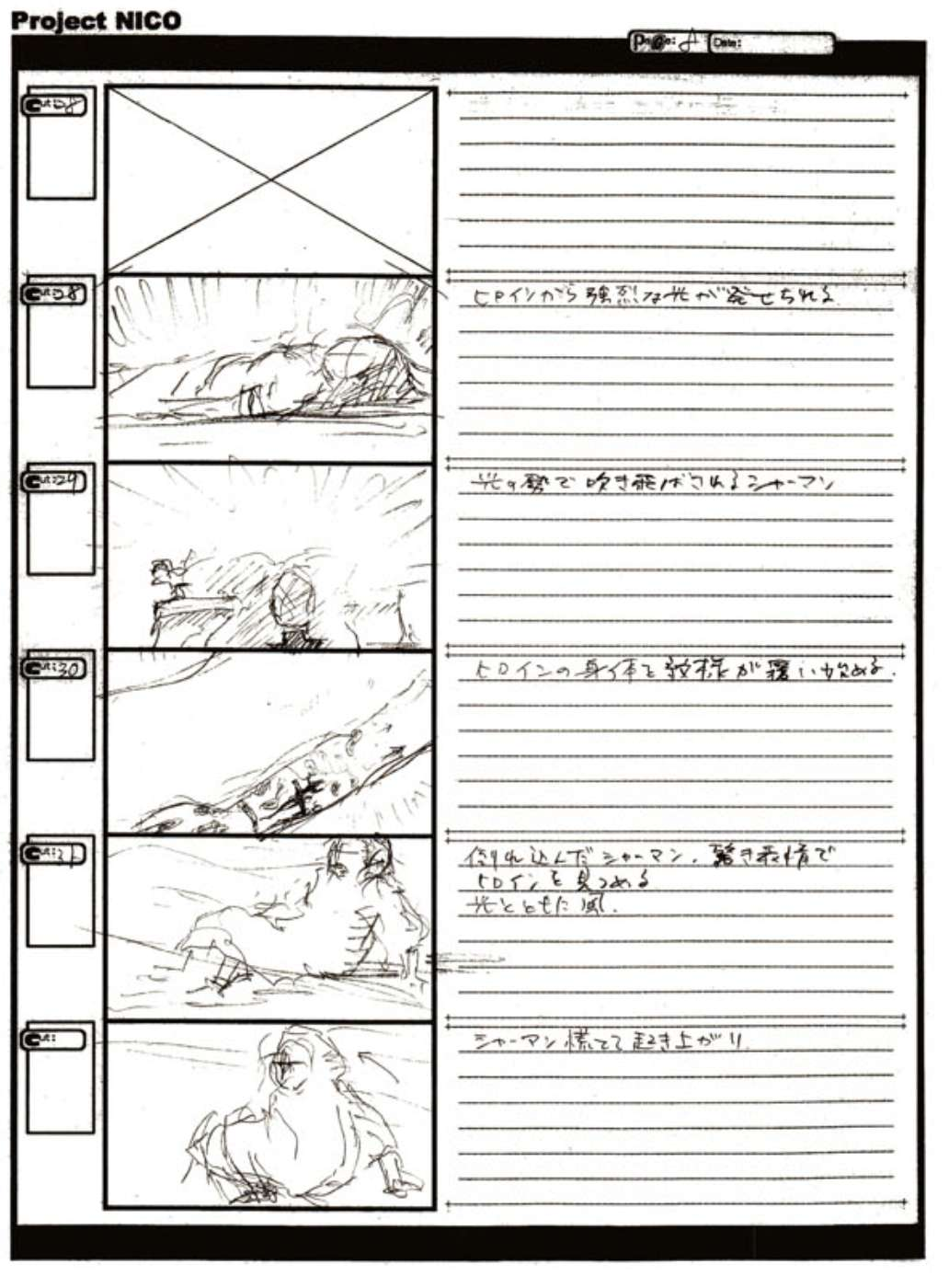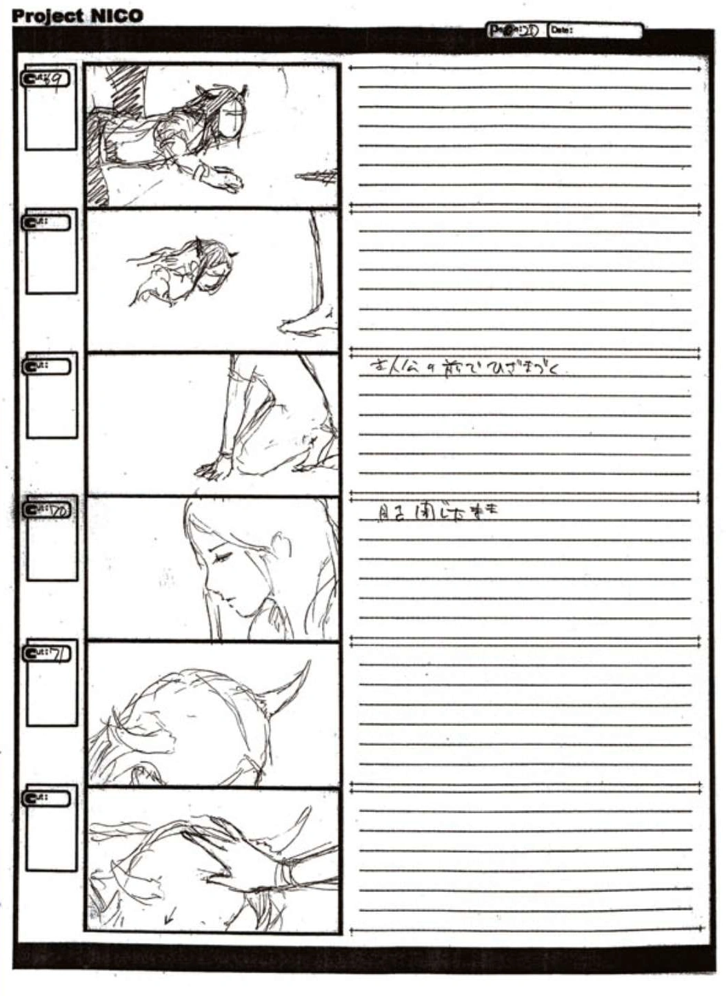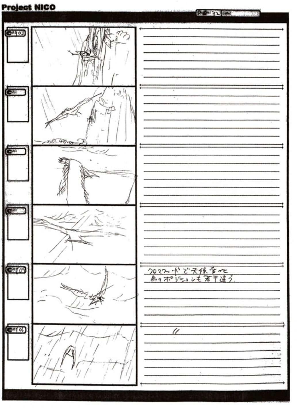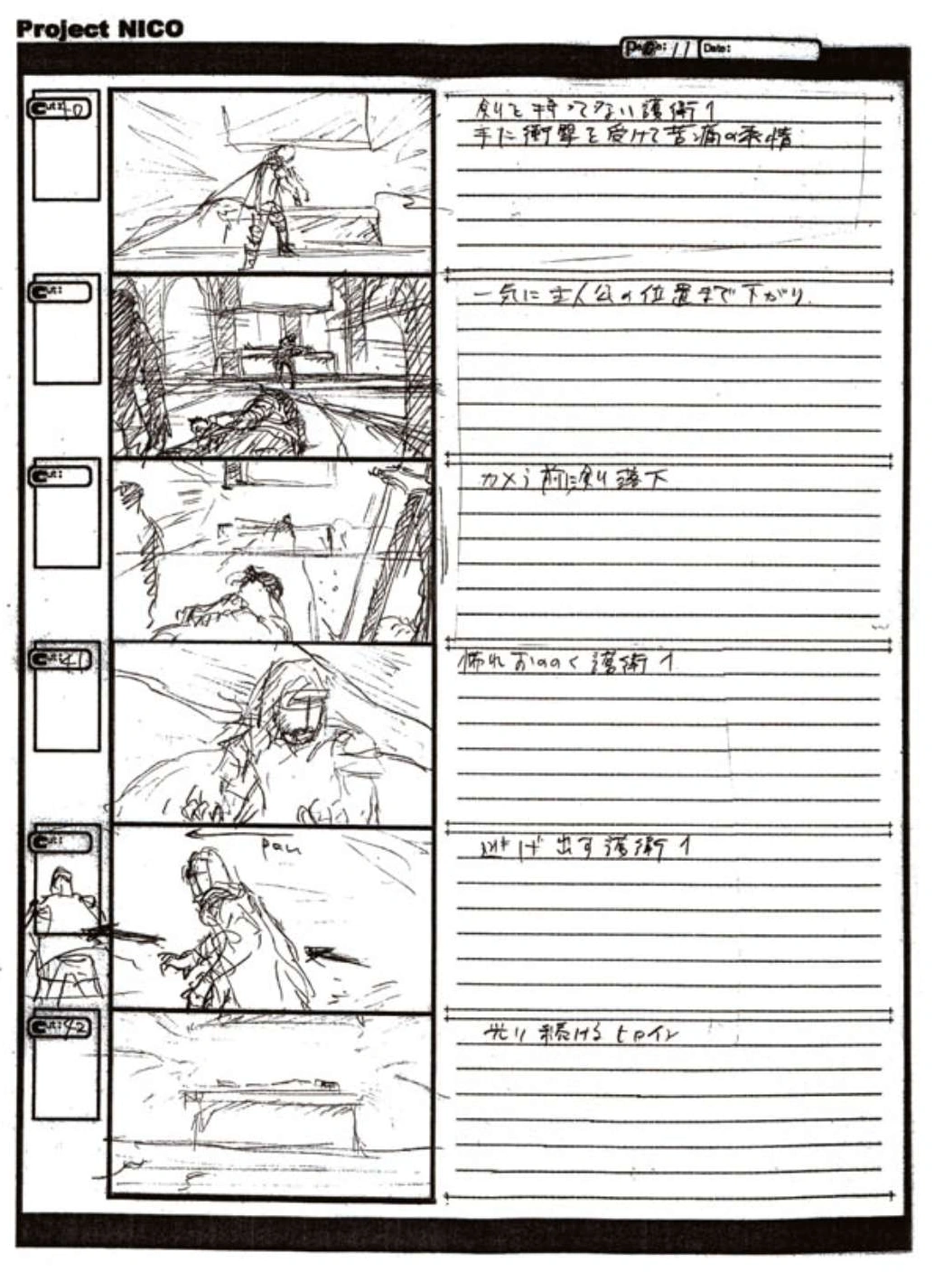 The World of Fumito Ueda artbook has storyboards of the entire alternate ending. They are all below. Translations will come at a later point in time. Pages 1 through 6 are used in the final ending. However, from page 8 onwards the ending differs heavily: In the page 8 of the final ending one of the guards stabs Wander with the Ancient Sword, while in the early ending's page 8 he is saved by Mono instead, leading to a completely different outcome.