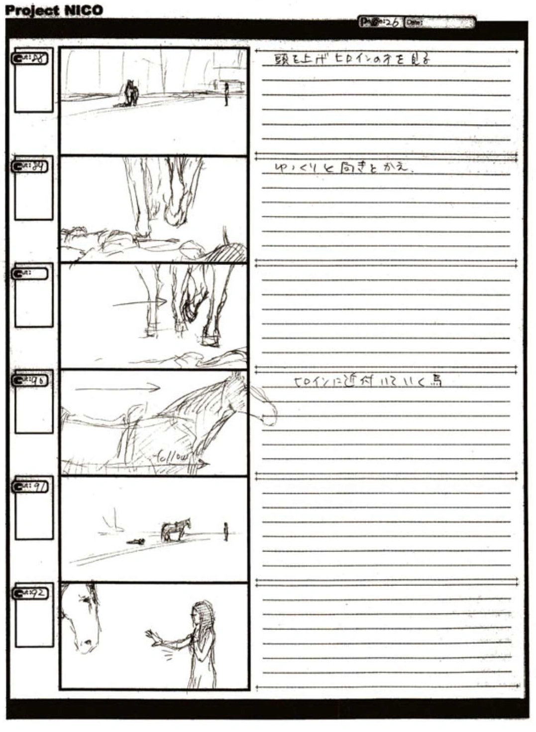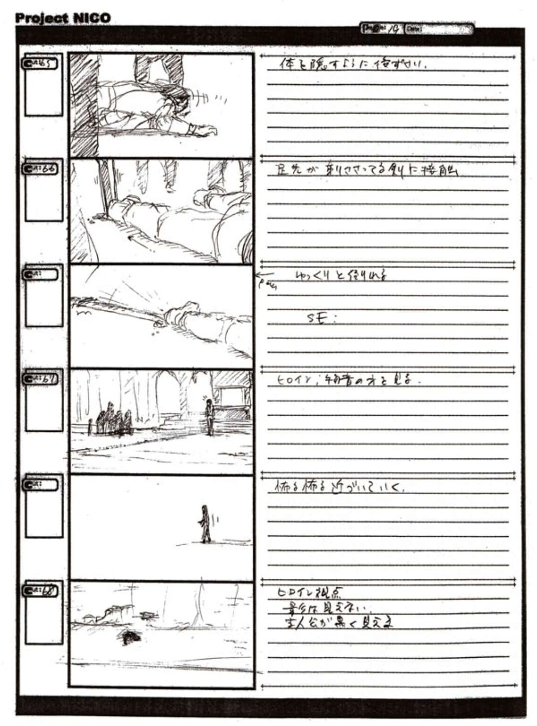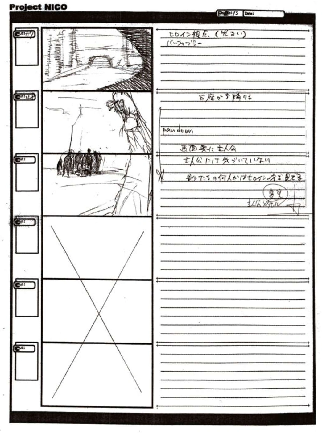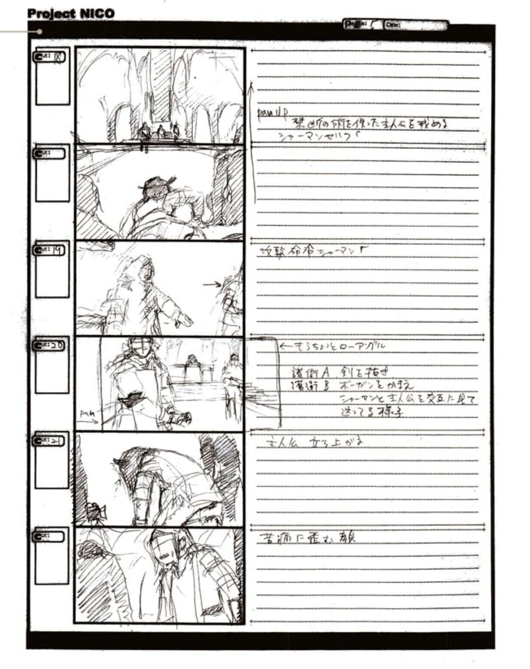 The World of Fumito Ueda artbook has storyboards of the entire alternate ending. They are all below. Translations will come at a later point in time. Pages 1 through 6 are used in the final ending. However, from page 8 onwards the ending differs heavily: In the page 8 of the final ending one of the guards stabs Wander with the Ancient Sword, while in the early ending's page 8 he is saved by Mono instead, leading to a completely different outcome.