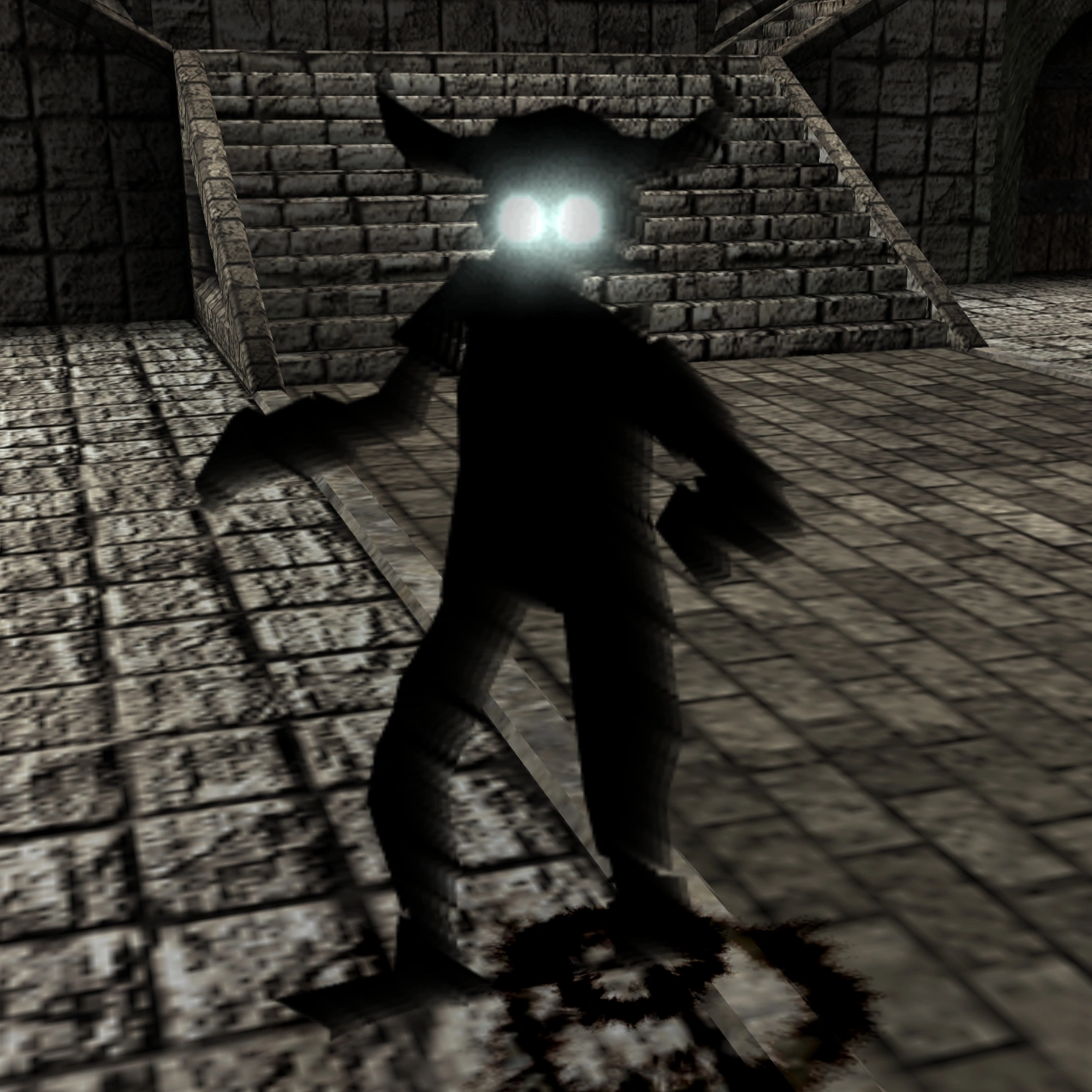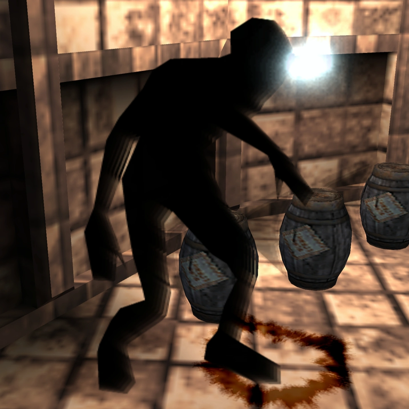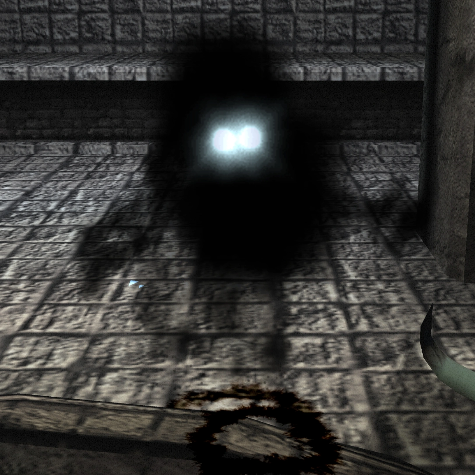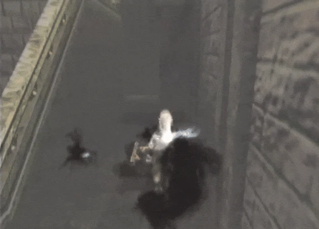 At some point in development, the separate limbs idea was discarded. Although those simplistic humanoid designs remained as only enemies in the game until at least April 2001, as seen in a video from Play-Pre 2 Volume 1. These shadows had a "light cone" effect for their eyes somewhat resembling searchlights. The model for this light cone still exists in the files of the retail game; named "eye_glow.p2o". This light cone would then be removed and replaced with blue after-images. The footstep effects were also white instead of black.