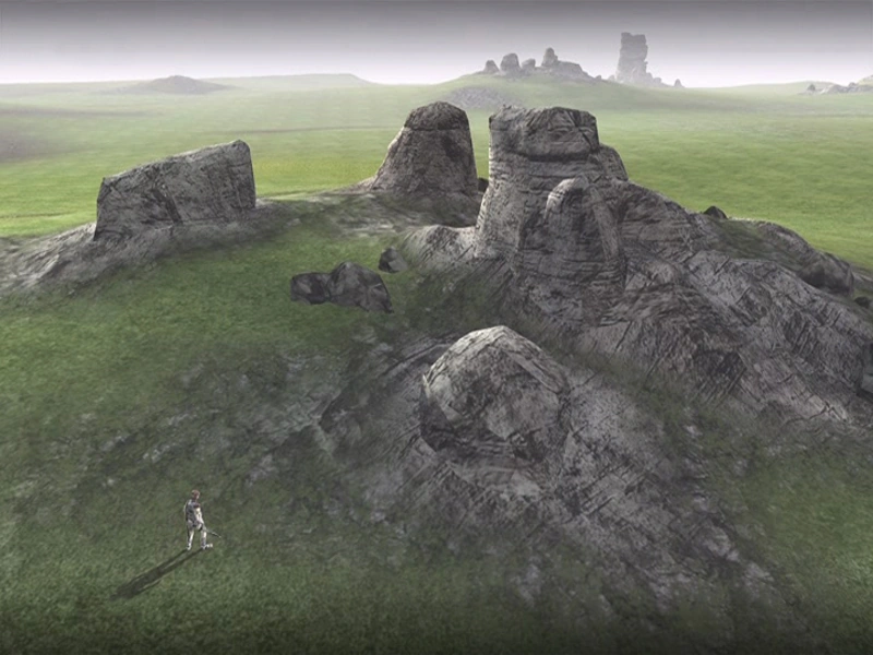 A vast green field with multiple rocks scattered around. Several stonehenge-like structures existed, which were used in the fight against the colossus.