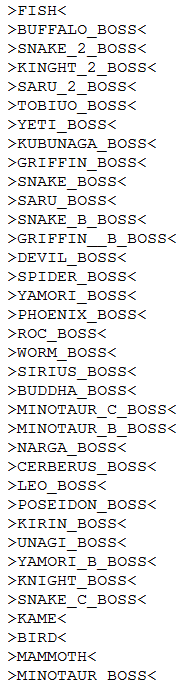 (*) Griffin and Saru are confirmed to have never been placed on the game's proper world map; Griffin was placed briefly on an earlier rejected map as a test, but didn't last long, and Saru could've only been encountered by booting up its test area.