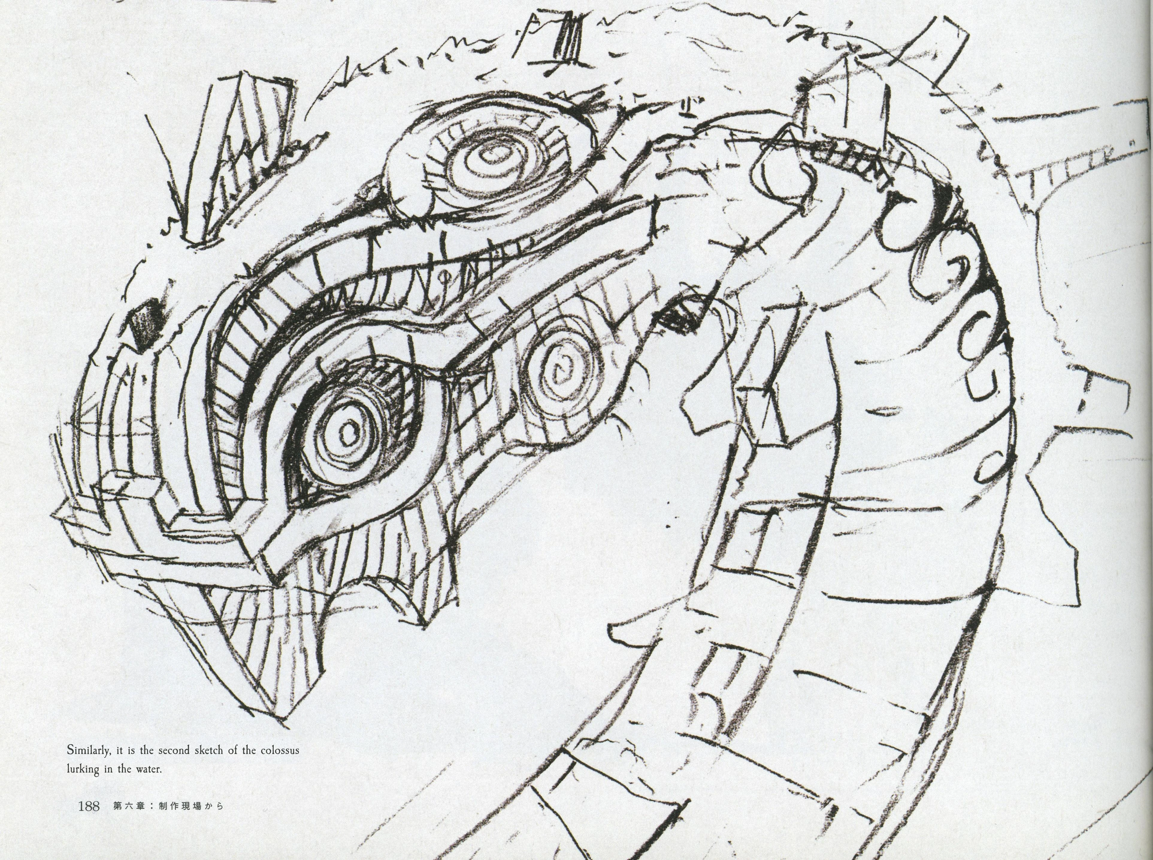 The first boss designed that would lurk in the water. It had a large serpentine body and whiskers like the 7th colossus.