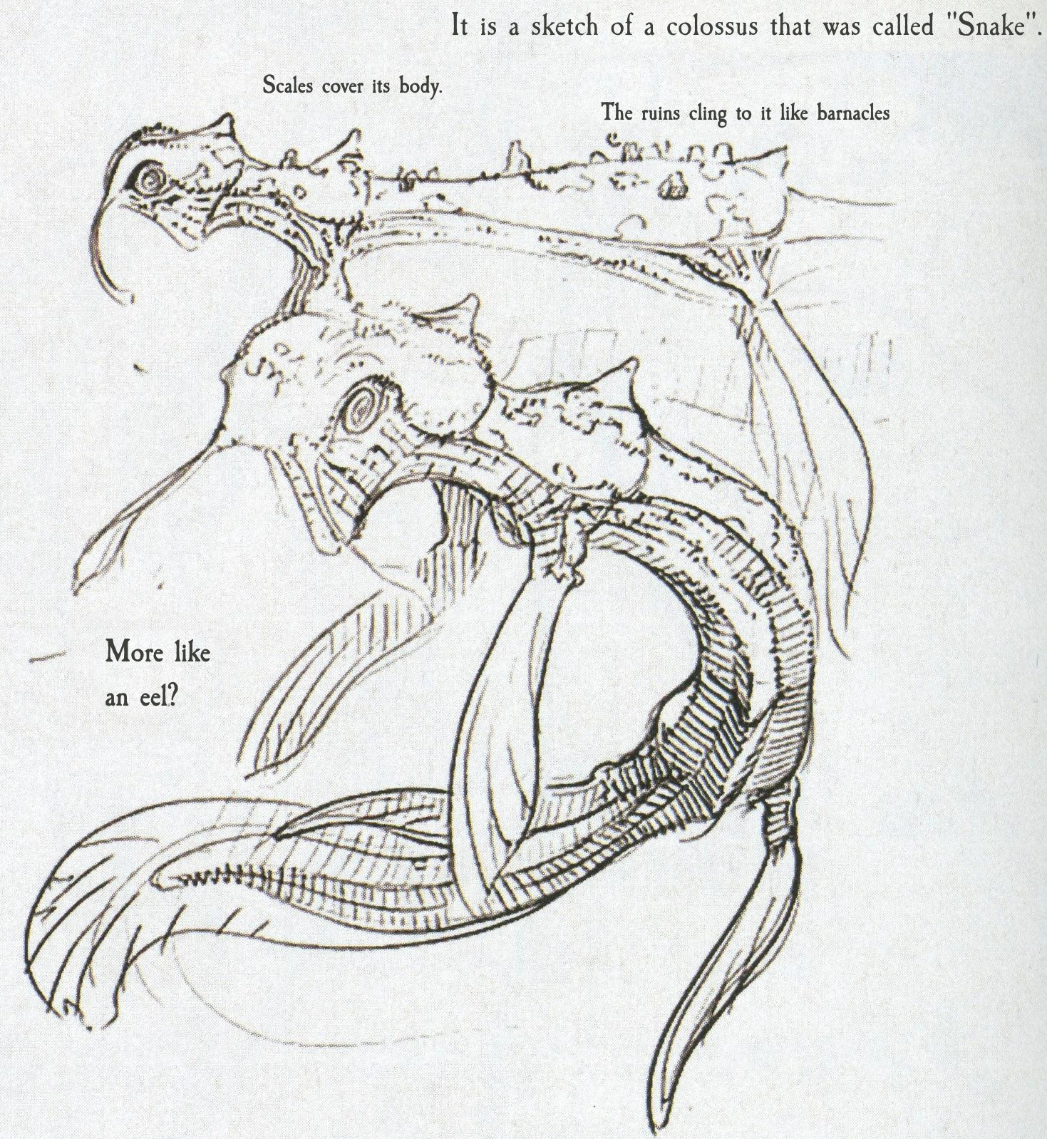 "Snake" is the development nickname of the 13th colossi, however, for some reason this boss is not included with other early sketches of the 13th colossus that are in the same section of the artbook. Its caption also doesn't mention it being an early version of the 13th, unlike the other aforementioned sketches.